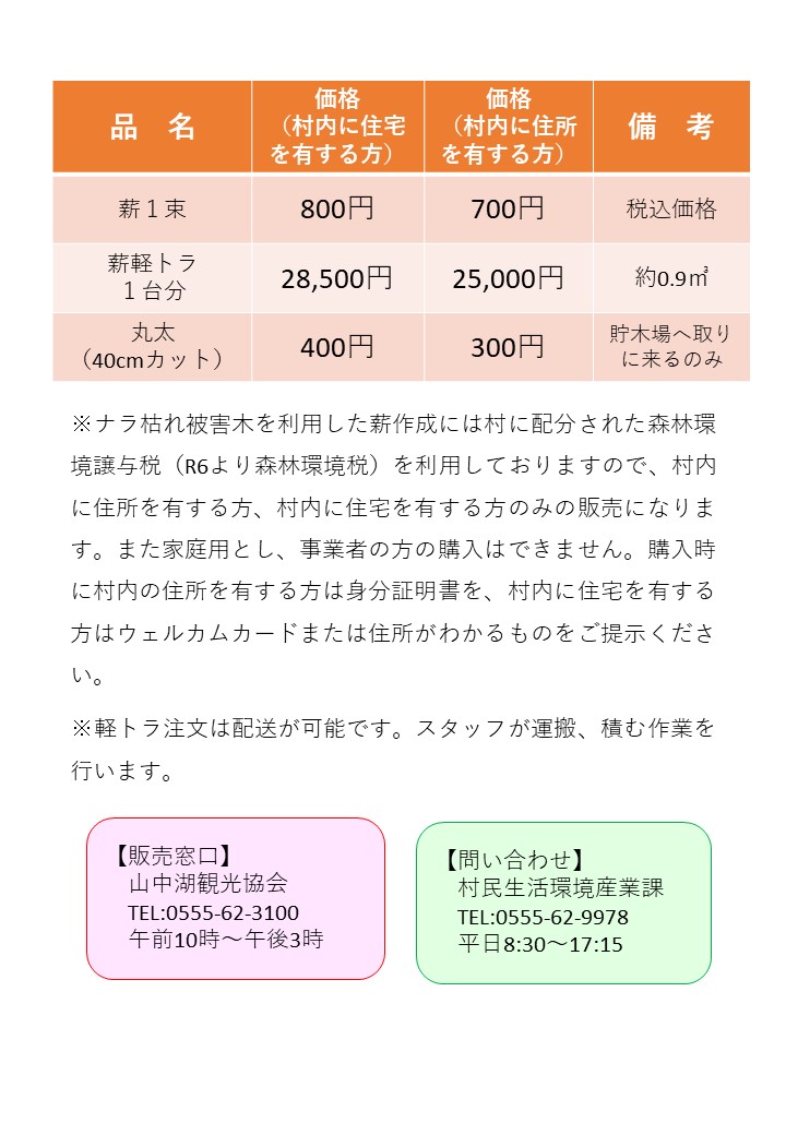 村ではナラ枯れ被害木を薪へと加工したものを現在販売しております。